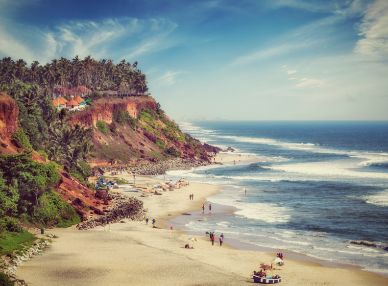 Imagine yourself descending a steep stairway that has been hacked out of the raw, red-rock face of a cliff in Kerala, India. The sea roars its welcome below you; tall palms wave too, their leafy shadows flirt shamelessly between you and the sun, casting weaving pattern-webs that at once cool and entrance.